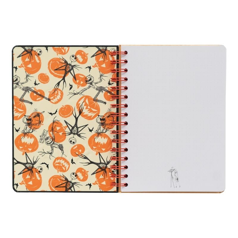 Nightmare Before Christmas. Tiene 90 hojas de tamaño A5. Cubiertas en tapa dura con encuadernación wire-o. Cierre con banda elástica. Incluye bolsillo interior. Esquinas exteriores redondeadas.