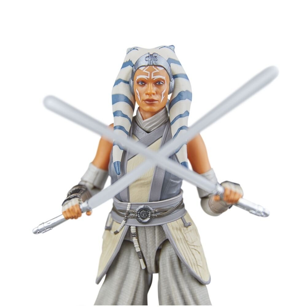 The Black Series. Tamaño: 15cm. Figura articulada. Cuenta con diseño premium, múltiples puntos de articulación y un diseño único inspirado en la aventura de Ahsoka en Mundo Entre Mundos. Esta figura de Ahsoka Tano (Peridea) viene con sus dos emblemáticos sables de luz.