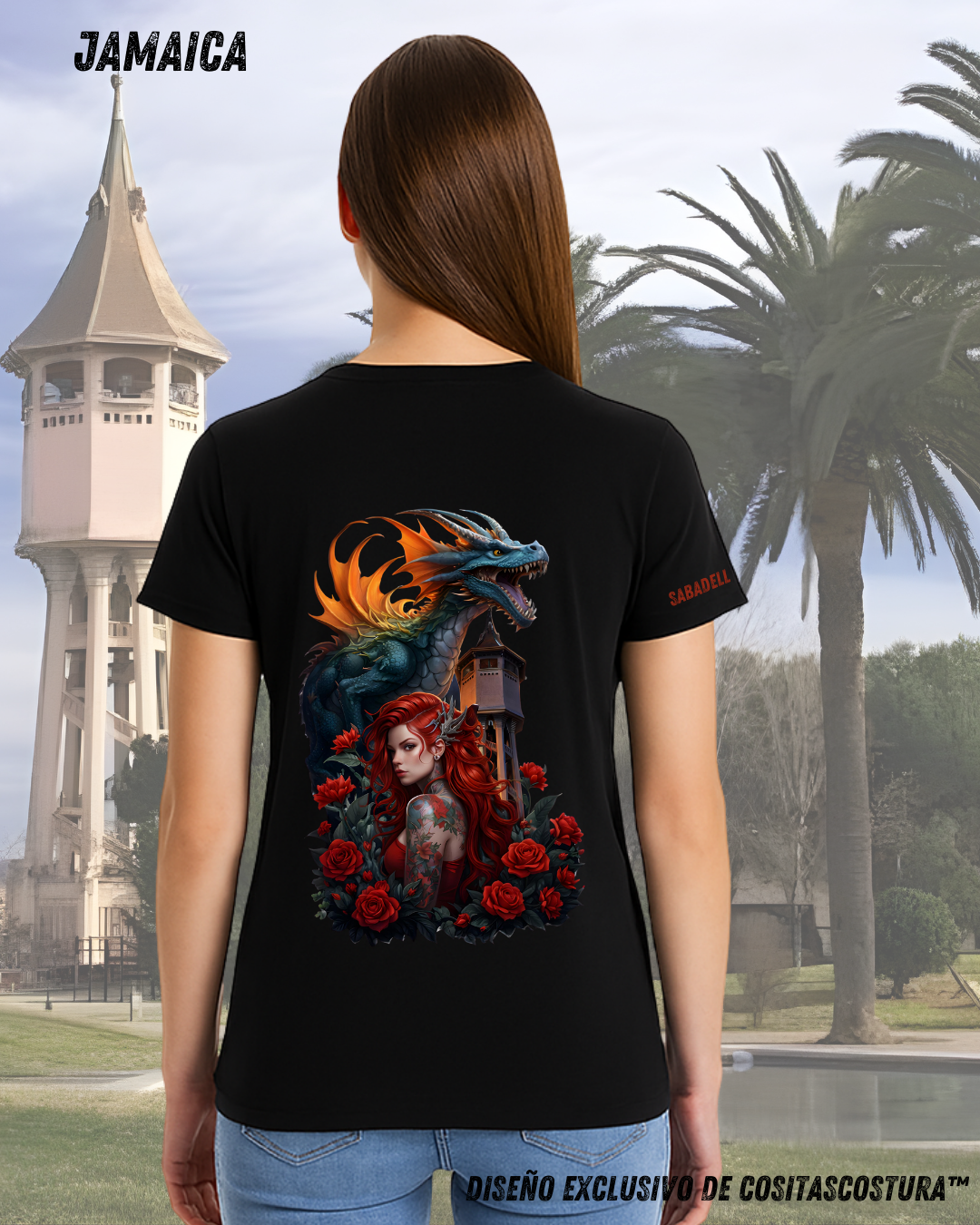Camiseta Negra Mujer Diseño Exclusivo Dragón en la Torre del Aigua – CositasCostura™