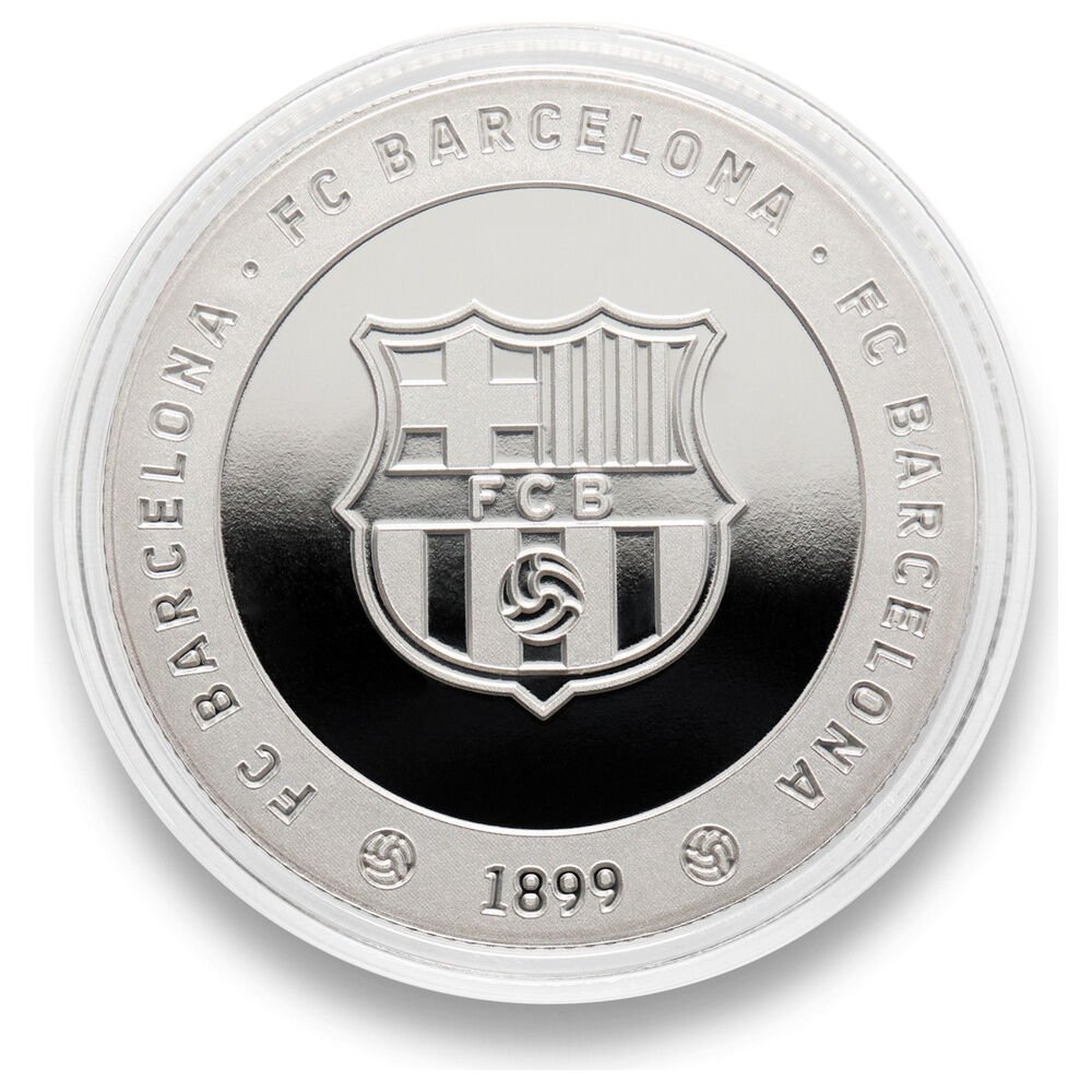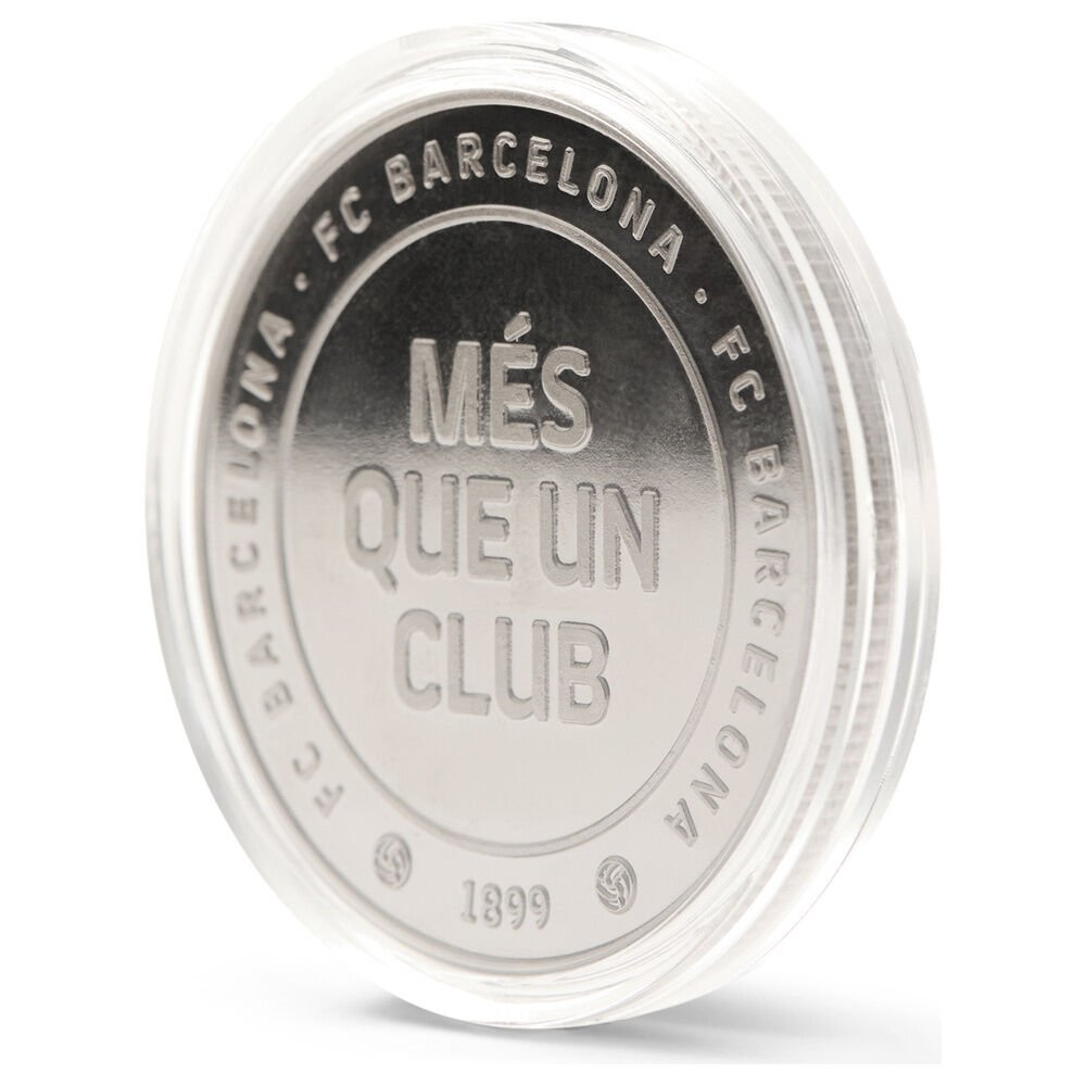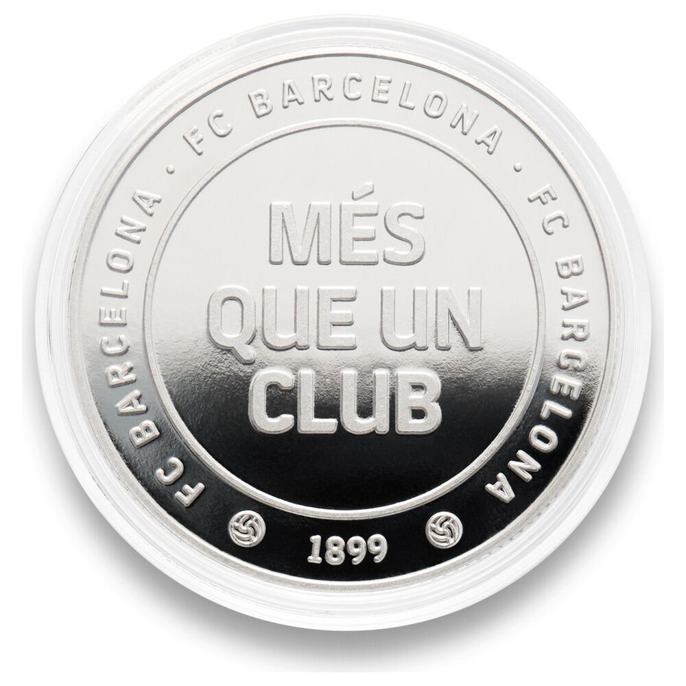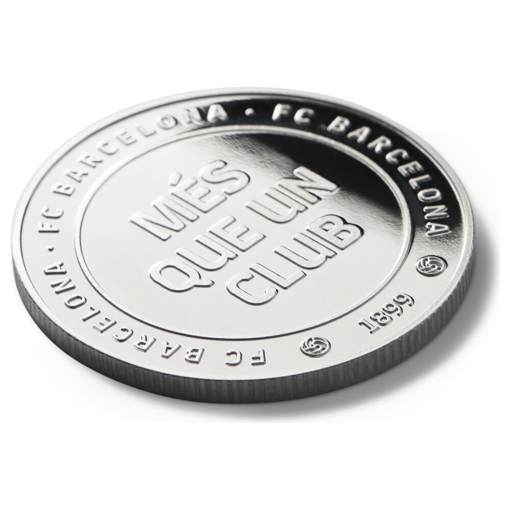 Vive el espíritu del club con la Moneda Oficial del FC Barcelona Més que un club en acabado plata. Fabricada en aleación de zink (zamak) y grabada en relieve por ambas caras, llega protegida en cápsula acrílica (Ø 4,5 cm) dentro de una caja individual de coleccionista. Dimensiones de la moneda: Ø 4 cm (grosor aprox. 0,6 cm). Artículo de colección sin valor facial.